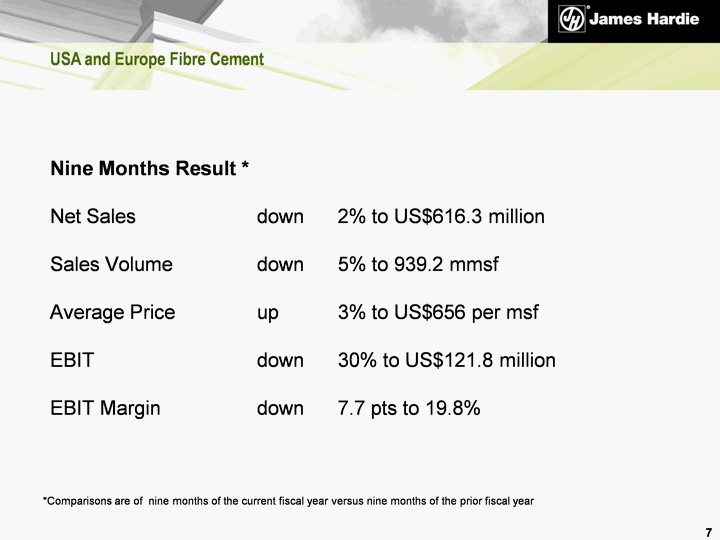 | 3rd Quarter Result * Net Sales up 2% to US$182.6 million Sales Volume up 1% to 277.9 mmsf Average Price up 1% to US$657 per msf EBIT down 34% to US$26.3 million EBIT Margin down 7.7 pts to 14.4% 6 USA and Europe Fibre Cement *Comparisons are of the 3rd quarter of the current fiscal year versus the 3rd quarter of the prior fiscal year |