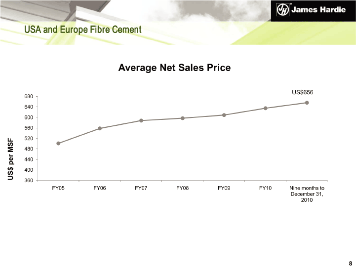 | Average Net Sales Price US$ per MSF USA and Europe Fibre Cement US$656 8 (CHART) |