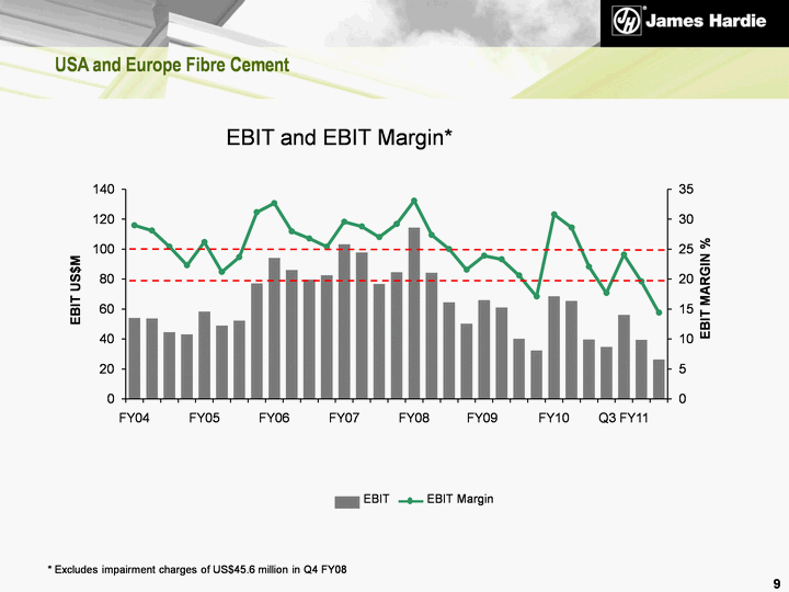 | (CHART) USA and Europe Fibre Cement * Excludes impairment charges of US$45.6 million in Q4 FY08 9 EBIT and EBIT Margin* EBIT EBIT Margin |