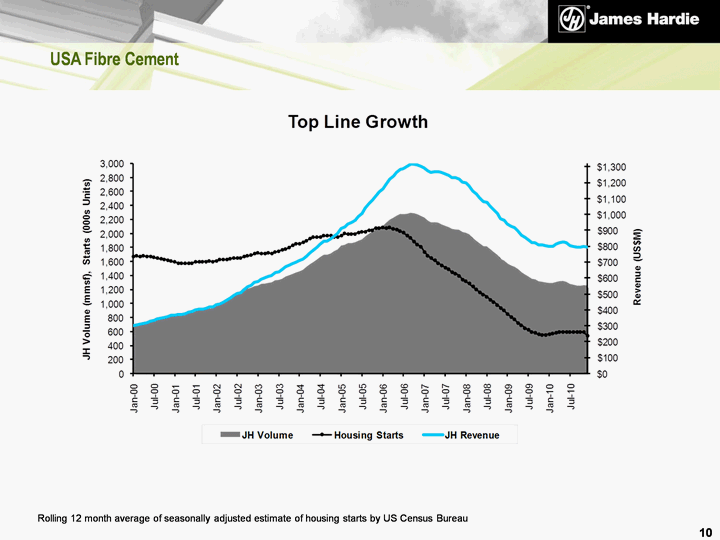 | USA Fibre Cement Rolling 12 month average of seasonally adjusted estimate of housing starts by US Census Bureau 10 |