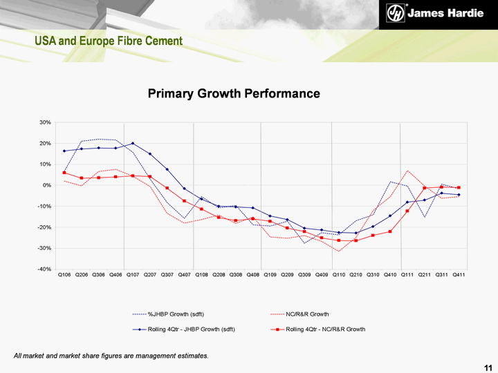 | USA and Europe Fibre Cement Primary Growth Performance All market and market share figures are management estimates. 11 |