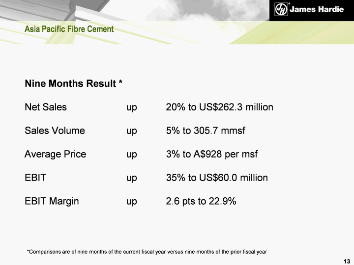 | 3rd Quarter Result * Net Sales up 10% to US$90.0 million Sales Volume down 1% to 99.6 mmsf Average Price up 2% to A$911 per msf EBIT up 16% to US$20.0 million EBIT Margin up 1.1 pts to 22.2% 12 Asia Pacific Fibre Cement *Comparisons are of the 3rd quarter of the current fiscal year versus the 3rd quarter of the prior fiscal year |