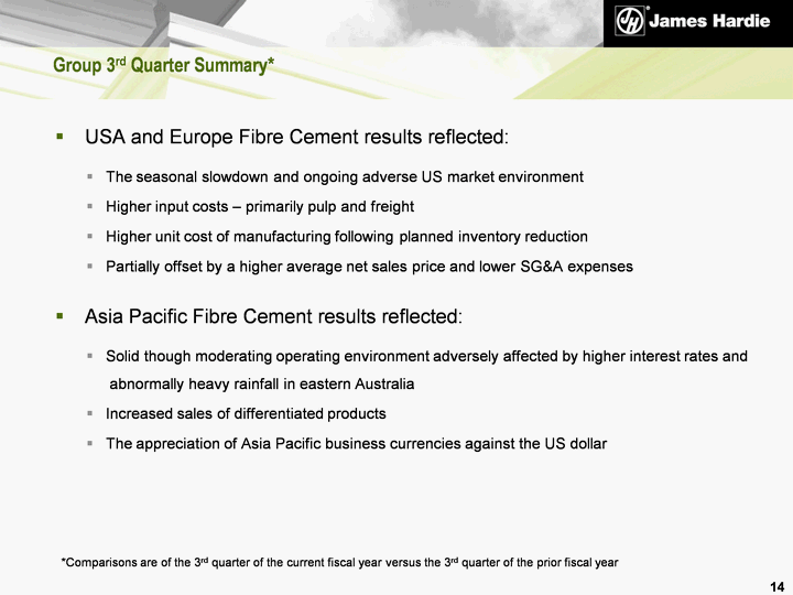 | Nine Months Result * Net Sales up 20% to US$262.3 million Sales Volume up 5% to 305.7 mmsf Average Price up 3% to A$928 per msf EBIT up 35% to US$60.0 million EBIT Margin up 2.6 pts to 22.9% 13 Asia Pacific Fibre Cement *Comparisons are of nine months of the current fiscal year versus nine months of the prior fiscal year |