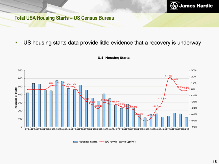 | 14 Group 3rd Quarter Summary* *Comparisons are of the 3rd quarter of the current fiscal year versus the 3rd quarter of the prior fiscal year USA and Europe Fibre Cement results reflected: The seasonal slowdown and ongoing adverse US market environment Higher input costs - primarily pulp and freight Higher unit cost of manufacturing following planned inventory reduction Partially offset by a higher average net sales price and lower SG&A expenses Asia Pacific Fibre Cement results reflected: Solid though moderating operating environment adversely affected by higher interest rates and abnormally heavy rainfall in eastern Australia Increased sales of differentiated products The appreciation of Asia Pacific business currencies against the US dollar |