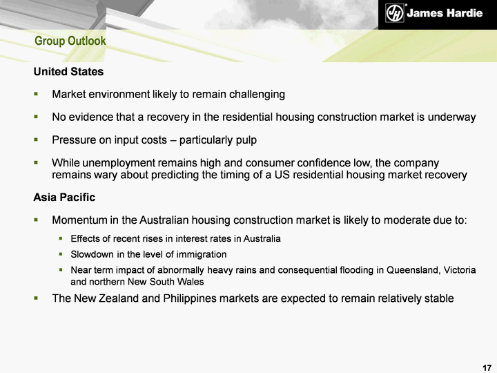 | Group Outlook 17 United States Market environment likely to remain challenging No evidence that a recovery in the residential housing construction market is underway Pressure on input costs - particularly pulp While unemployment remains high and consumer confidence low, the company remains wary about predicting the timing of a US residential housing market recovery Asia Pacific Momentum in the Australian housing construction market is likely to moderate due to: Effects of recent rises in interest rates in Australia Slowdown in the level of immigration Near term impact of abnormally heavy rains and consequential flooding in Queensland, Victoria and northern New South Wales The New Zealand and Philippines markets are expected to remain relatively stable |