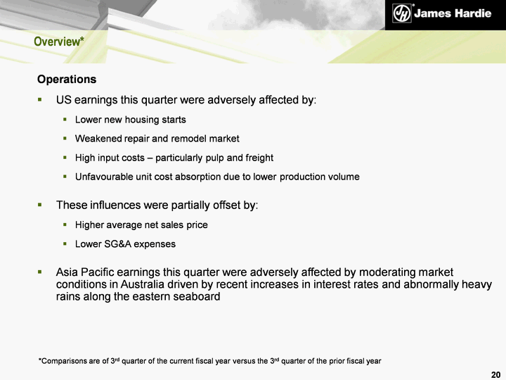 | Overview* 20 *Comparisons are of 3rd quarter of the current fiscal year versus the 3rd quarter of the prior fiscal year Operations US earnings this quarter were adversely affected by: Lower new housing starts Weakened repair and remodel market High input costs - particularly pulp and freight Unfavourable unit cost absorption due to lower production volume These influences were partially offset by: Higher average net sales price Lower SG&A expenses Asia Pacific earnings this quarter were adversely affected by moderating market conditions in Australia driven by recent increases in interest rates and abnormally heavy rains along the eastern seaboard |