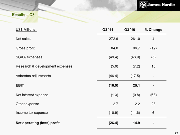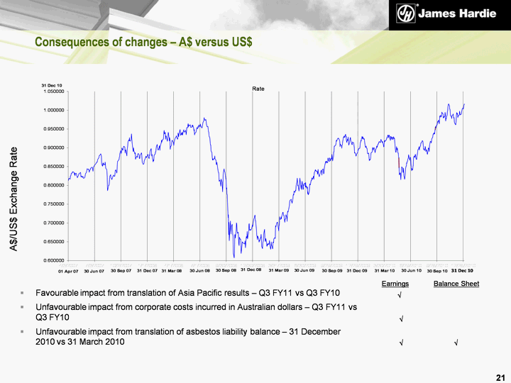 | Consequences of changes - A$ versus US$ A$/US$ Exchange Rate Favourable impact from translation of Asia Pacific results - Q3 FY11 vs Q3 FY10 Unfavourable impact from corporate costs incurred in Australian dollars - Q3 FY11 vs Q3 FY10 Unfavourable impact from translation of asbestos liability balance - 31 December 2010 vs 31 March 2010 21 Earnings Balance Sheet ^ ^ ^ ^ |