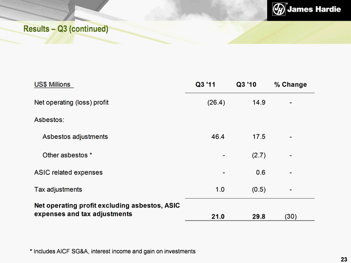 | 37 Summary USA and Europe Fibre Cement 3rd quarter EBIT decreased by 34% to US$26.3 million due mainly to unfavourable cost absorption and higher input costs partially offset by a higher net sales price and a reduction in SG&A expenses. For the nine months, EBIT fell 30% to US$121.8 million Asia Pacific 3rd quarter EBIT increased 16% to US$20.0 million. Favourable currency exchange rate movements accounted for 13% of this increase. For the nine months EBIT increased 35% to US$60.0 million The Company's net operating profit excluding asbestos, ASIC expense and tax adjustments decreased 30% and 25% in the quarter and nine months respectively to US$21.0 million and US$82.2 million |