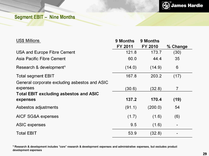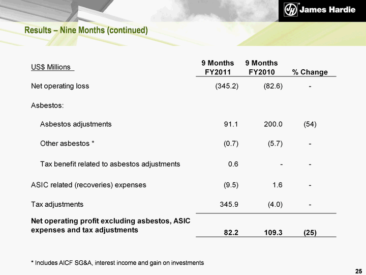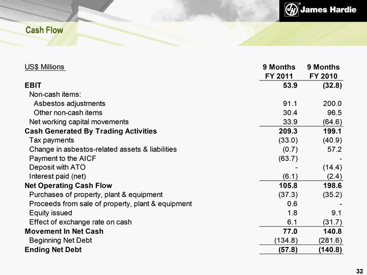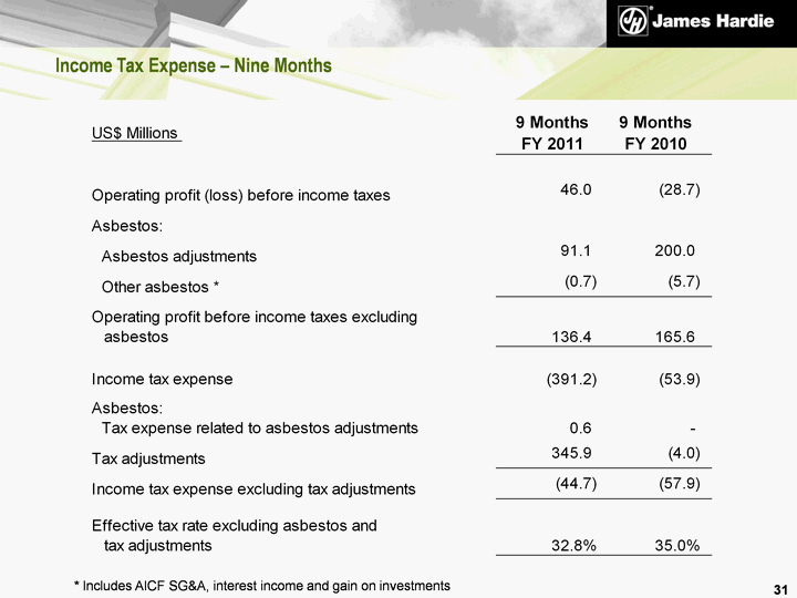 | Legacy Issues Update 34 ATO - 1999 Disputed Amended Assessment James Hardie's initial appeal dismissed in September 2010 Appeal to full bench of the Federal Court expected to be heard in 2011 Charge of US$345.2 million effective 1 September 2010 (no impact to net operating cash flow for the nine month period) ASIC Proceedings Court of Appeal judgement handed down on 17 December 2010 Company's appeal dismissed Non-executive directors appeals upheld ASIC and former executives seeking special leave to appeal certain aspects of Court of Appeal judgment to the High Court of Australia Determination of special leave applications expected by August 2011 Asbestos NSW and Australian Governments announced on 7 December 2010 that a standby loan facility of up to A$320 million for the AICF had been formalised Satisfaction of conditions precedent to drawdown currently in process |
