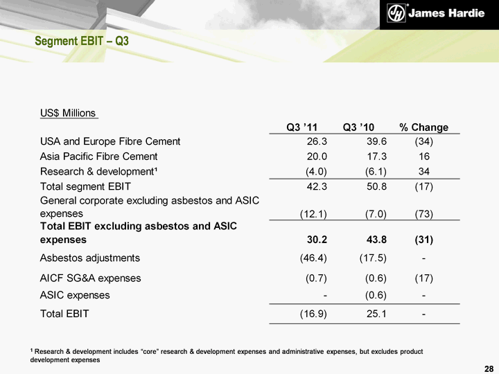| 1 Research & development includes "core" research & development expenses and administrative expenses, but excludes product development expenses Segment EBIT - Q3 28 |