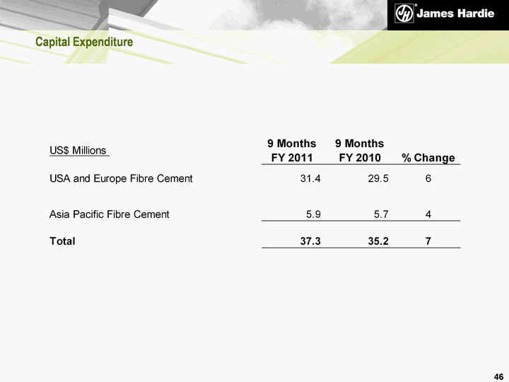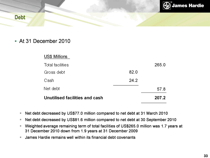 | Debt Net debt decreased by US$77.0 million compared to net debt at 31 March 2010 Net debt decreased by US$81.6 million compared to net debt at 30 September 2010 Weighted average remaining term of total facilities of US$265.0 million was 1.7 years at 31 December 2010 down from 1.9 years at 31 December 2009 James Hardie remains well within its financial debt covenants 33 At 31 December 2010 |