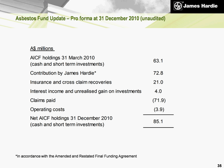 | Asbestos Fund Update - Pro forma at 31 December 2010 (unaudited) 35 *In accordance with the Amended and Restated Final Funding Agreement |