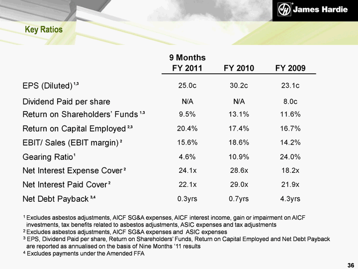 | Key Ratios 1 Excludes asbestos adjustments, AICF SG&A expenses, AICF interest income, gain or impairment on AICF investments, tax benefits related to asbestos adjustments, ASIC expenses and tax adjustments 2 Excludes asbestos adjustments, AICF SG&A expenses and ASIC expenses 3 EPS, Dividend Paid per share, Return on Shareholders' Funds, Return on Capital Employed and Net Debt Payback are reported as annualised on the basis of Nine Months '11 results 4 Excludes payments under the Amended FFA 36 |