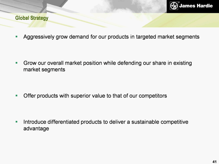 | Aggressively grow demand for our products in targeted market segments Grow our overall market position while defending our share in existing market segments Offer products with superior value to that of our competitors Introduce differentiated products to deliver a sustainable competitive advantage 41 Global Strategy |