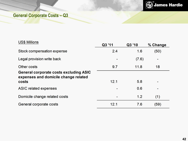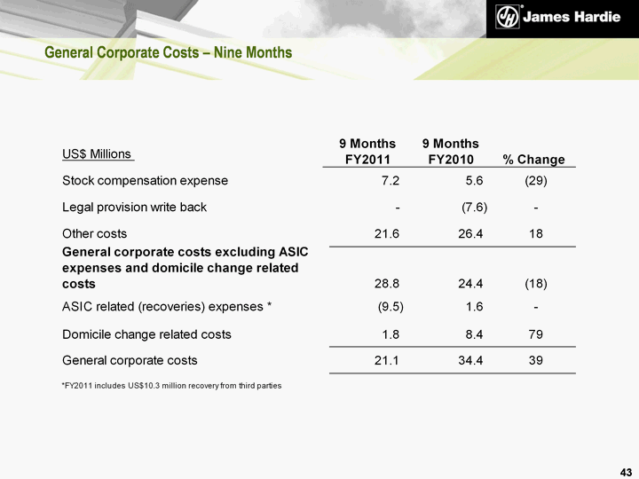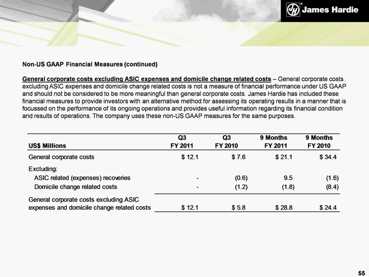 | Non-US GAAP Financial Measures (continued) General corporate costs excluding ASIC expenses and domicile change related costs - General corporate costs excluding ASIC expenses and domicile change related costs is not a measure of financial performance under US GAAP and should not be considered to be more meaningful than general corporate costs. James Hardie has included these financial measures to provide investors with an alternative method for assessing its operating results in a manner that is focussed on the performance of its ongoing operations and provides useful information regarding its financial condition and results of operations. The company uses these non-US GAAP measures for the same purposes. 55 |