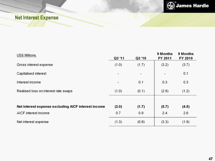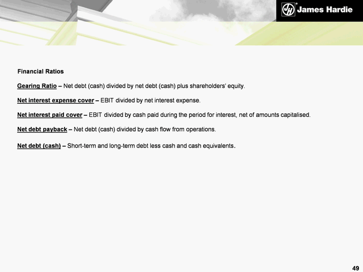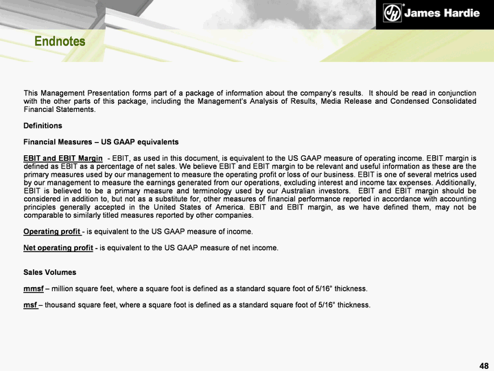 | Endnotes This Management Presentation forms part of a package of information about the company's results. It should be read in conjunction with the other parts of this package, including the Management's Analysis of Results, Media Release and Condensed Consolidated Financial Statements. Definitions Financial Measures - US GAAP equivalents EBIT and EBIT Margin - EBIT, as used in this document, is equivalent to the US GAAP measure of operating income. EBIT margin is defined as EBIT as a percentage of net sales. We believe EBIT and EBIT margin to be relevant and useful information as these are the primary measures used by our management to measure the operating profit or loss of our business. EBIT is one of several metrics used by our management to measure the earnings generated from our operations, excluding interest and income tax expenses. Additionally, EBIT is believed to be a primary measure and terminology used by our Australian investors. EBIT and EBIT margin should be considered in addition to, but not as a substitute for, other measures of financial performance reported in accordance with accounting principles generally accepted in the United States of America. EBIT and EBIT margin, as we have defined them, may not be comparable to similarly titled measures reported by other companies. Operating profit - is equivalent to the US GAAP measure of income. Net operating profit - is equivalent to the US GAAP measure of net income. Sales Volumes mmsf - million square feet, where a square foot is defined as a standard square foot of 5/16" thickness. msf - thousand square feet, where a square foot is defined as a standard square foot of 5/16" thickness. 48 |