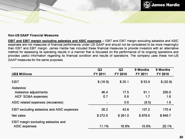 | Non-US GAAP Financial Measures EBIT and EBIT margin excluding asbestos and ASIC expenses - EBIT and EBIT margin excluding asbestos and ASIC expenses are not measures of financial performance under US GAAP and should not be considered to be more meaningful than EBIT and EBIT margin. James Hardie has included these financial measures to provide investors with an alternative method for assessing its operating results in a manner that is focussed on the performance of its ongoing operations and provides useful information regarding its financial condition and results of operations. The company uses these non-US GAAP measures for the same purposes. 50 |