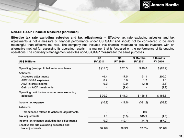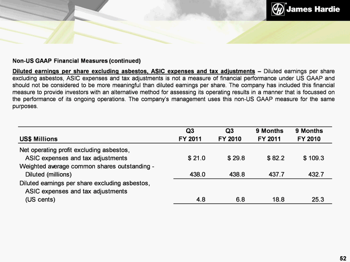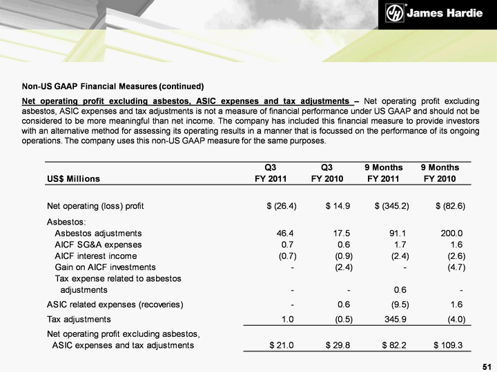 | Non-US GAAP Financial Measures (continued) Net operating profit excluding asbestos, ASIC expenses and tax adjustments - Net operating profit excluding asbestos, ASIC expenses and tax adjustments is not a measure of financial performance under US GAAP and should not be considered to be more meaningful than net income. The company has included this financial measure to provide investors with an alternative method for assessing its operating results in a manner that is focussed on the performance of its ongoing operations. The company uses this non-US GAAP measure for the same purposes. 51 |