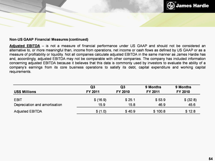 | Non-US GAAP Financial Measures (continued) Adjusted EBITDA - is not a measure of financial performance under US GAAP and should not be considered an alternative to, or more meaningful than, income from operations, net income or cash flows as defined by US GAAP or as a measure of profitability or liquidity. Not all companies calculate adjusted EBITDA in the same manner as James Hardie has and, accordingly, adjusted EBITDA may not be comparable with other companies. The company has included information concerning adjusted EBITDA because it believes that this data is commonly used by investors to evaluate the ability of a company's earnings from its core business operations to satisfy its debt, capital expenditure and working capital requirements. 54 |