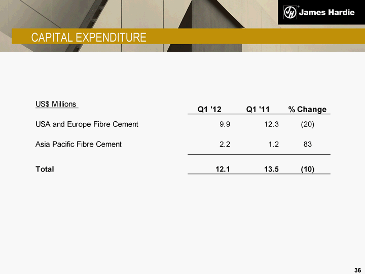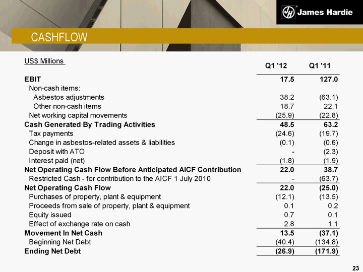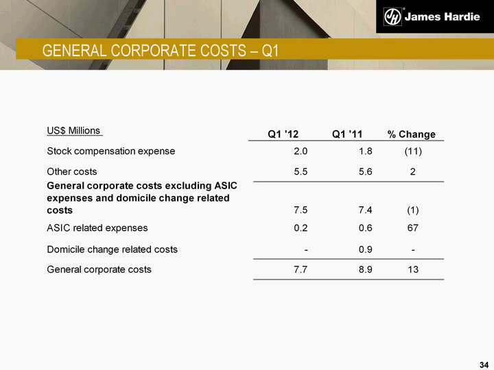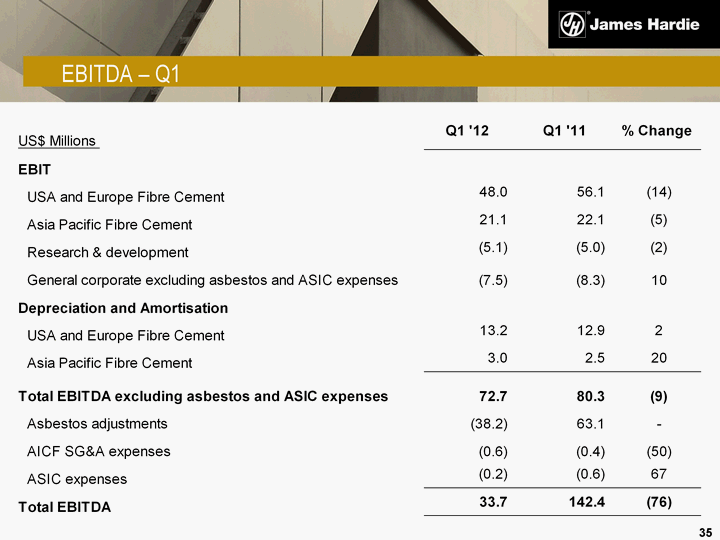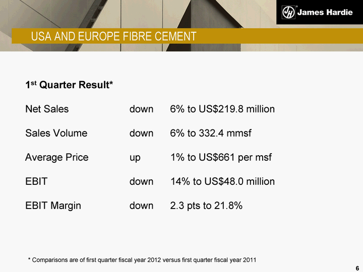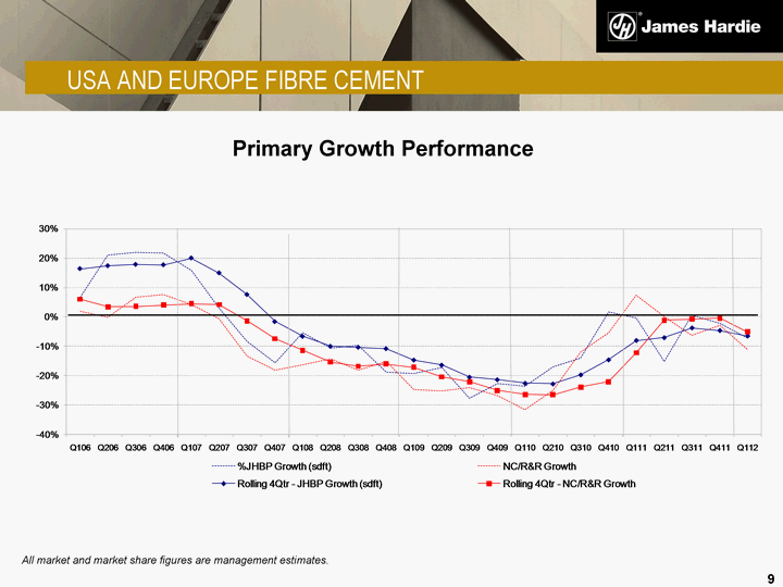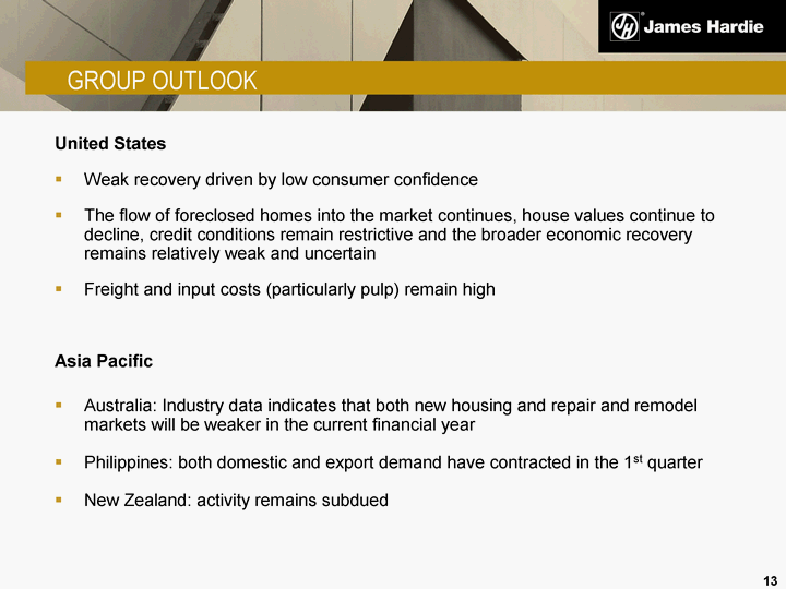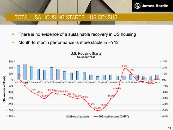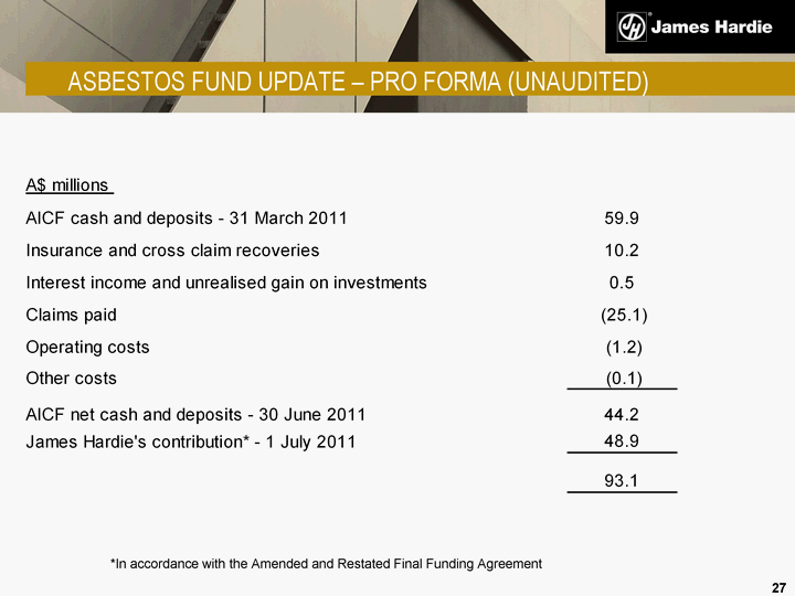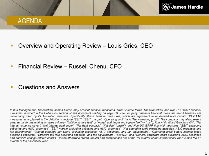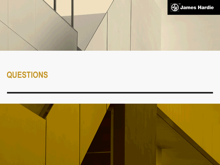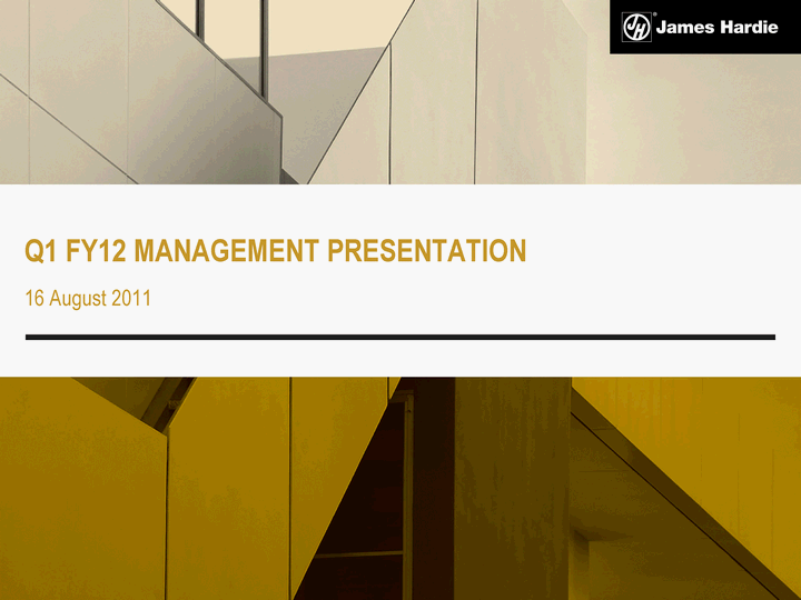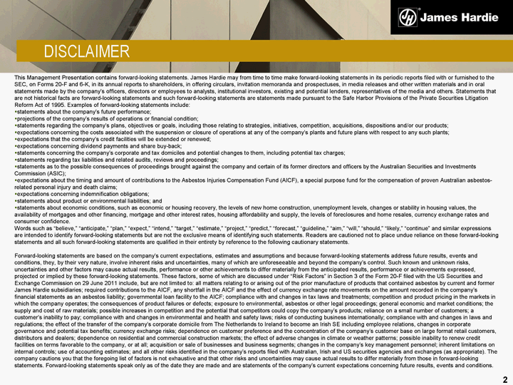 | This Management Presentation contains forward-looking statements. James Hardie may from time to time make forward-looking statements in its periodic reports filed with or furnished to the SEC, on Forms 20-F and 6-K, in its annual reports to shareholders, in offering circulars, invitation memoranda and prospectuses, in media releases and other written materials and in oral statements made by the company's officers, directors or employees to analysts, institutional investors, existing and potential lenders, representatives of the media and others. Statements that are not historical facts are forward-looking statements and such forward-looking statements are statements made pursuant to the Safe Harbor Provisions of the Private Securities Litigation Reform Act of 1995. Examples of forward-looking statements include: statements about the company's future performance; projections of the company's results of operations or financial condition; statements regarding the company's plans, objectives or goals, including those relating to strategies, initiatives, competition, acquisitions, dispositions and/or our products; expectations concerning the costs associated with the suspension or closure of operations at any of the company's plants and future plans with respect to any such plants; expectations that the company's credit facilities will be extended or renewed; expectations concerning dividend payments and share buy-back; statements concerning the company's corporate and tax domiciles and potential changes to them, including potential tax charges; statements regarding tax liabilities and related audits, reviews and proceedings; statements as to the possible consequences of proceedings brought against the company and certain of its former directors and officers by the Australian Securities and Investments Commission (ASIC); expectations about the timing and amount of contributions to the Asbestos Injuries Compensation Fund (AICF), a special purpose fund for the compensation of proven Australian asbestos- related personal injury and death claims; expectations concerning indemnification obligations; statements about product or environmental liabilities; and statements about economic conditions, such as economic or housing recovery, the levels of new home construction, unemployment levels, changes or stability in housing values, the availability of mortgages and other financing, mortgage and other interest rates, housing affordability and supply, the levels of foreclosures and home resales, currency exchange rates and consumer confidence. Words such as "believe," "anticipate," "plan," "expect," "intend," "target," "estimate," "project," "predict," "forecast," "guideline," "aim," "will," "should," "likely," "continue" and similar expressions are intended to identify forward-looking statements but are not the exclusive means of identifying such statements. Readers are cautioned not to place undue reliance on these forward-looking statements and all such forward-looking statements are qualified in their entirety by reference to the following cautionary statements. Forward-looking statements are based on the company's current expectations, estimates and assumptions and because forward-looking statements address future results, events and conditions, they, by their very nature, involve inherent risks and uncertainties, many of which are unforeseeable and beyond the company's control. Such known and unknown risks, uncertainties and other factors may cause actual results, performance or other achievements to differ materially from the anticipated results, performance or achievements expressed, projected or implied by these forward-looking statements. These factors, some of which are discussed under "Risk Factors" in Section 3 of the Form 20-F filed with the US Securities and Exchange Commission on 29 June 2011 include, but are not limited to: all matters relating to or arising out of the prior manufacture of products that contained asbestos by current and former James Hardie subsidiaries; required contributions to the AICF, any shortfall in the AICF and the effect of currency exchange rate movements on the amount recorded in the company's financial statements as an asbestos liability; governmental loan facility to the AICF; compliance with and changes in tax laws and treatments; competition and product pricing in the markets in which the company operates; the consequences of product failures or defects; exposure to environmental, asbestos or other legal proceedings; general economic and market conditions; the supply and cost of raw materials; possible increases in competition and the potential that competitors could copy the company's products; reliance on a small number of customers; a customer's inability to pay; compliance with and changes in environmental and health and safety laws; risks of conducting business internationally; compliance with and changes in laws and regulations; the effect of the transfer of the company's corporate domicile from The Netherlands to Ireland to become an Irish SE including employee relations, changes in corporate governance and potential tax benefits; currency exchange risks; dependence on customer preference and the concentration of the company's customer base on large format retail customers, distributors and dealers; dependence on residential and commercial construction markets; the effect of adverse changes in climate or weather patterns; possible inability to renew credit facilities on terms favorable to the company, or at all; acquisition or sale of businesses and business segments; changes in the company's key management personnel; inherent limitations on internal controls; use of accounting estimates; and all other risks identified in the company's reports filed with Australian, Irish and US securities agencies and exchanges (as appropriate). The company cautions you that the foregoing list of factors is not exhaustive and that other risks and uncertainties ma