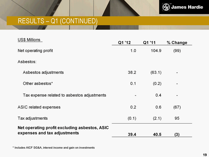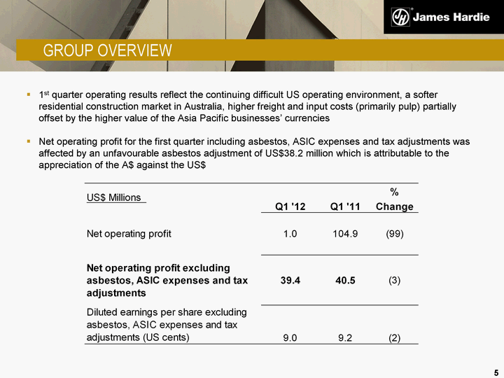 | 1st quarter operating results reflect the continuing difficult US operating environment, a softer residential construction market in Australia, higher freight and input costs (primarily pulp) partially offset by the higher value of the Asia Pacific businesses' currencies Net operating profit for the first quarter including asbestos, ASIC expenses and tax adjustments was affected by an unfavourable asbestos adjustment of US$38.2 million which is attributable to the appreciation of the A$ against the US$ 5 GROUP OVERVIEW |