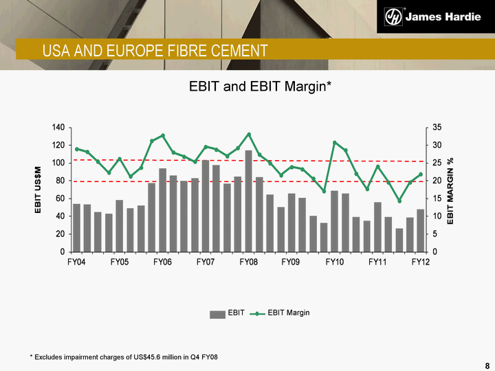 | * Excludes impairment charges of US$45.6 million in Q4 FY08 8 EBIT and EBIT Margin* EBIT EBIT Margin USA AND EUROPE FIBRE CEMENT |