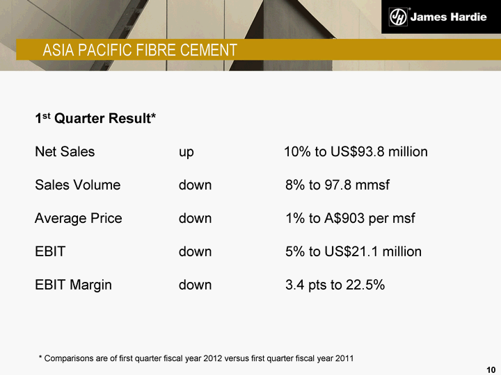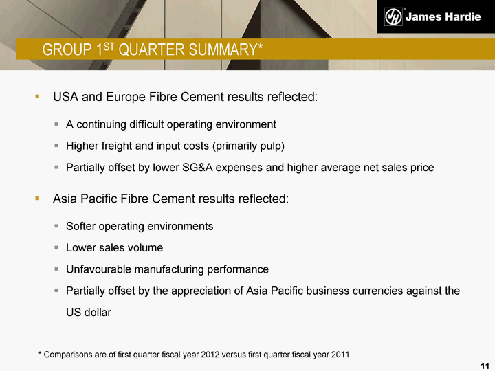 | 1st Quarter Result* Net Sales up 10% to US$93.8 million Sales Volume down 8% to 97.8 mmsf Average Price down 1% to A$903 per msf EBIT down 5% to US$21.1 million EBIT Margin down 3.4 pts to 22.5% 10 ASIA PACIFIC FIBRE CEMENT * Comparisons are of first quarter fiscal year 2012 versus first quarter fiscal year 2011 |