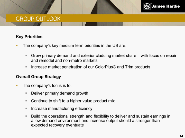 | United States Weak recovery driven by low consumer confidence The flow of foreclosed homes into the market continues, house values continue to decline, credit conditions remain restrictive and the broader economic recovery remains relatively weak and uncertain Freight and input costs (particularly pulp) remain high Asia Pacific Australia: Industry data indicates that both new housing and repair and remodel markets will be weaker in the current financial year Philippines: both domestic and export demand have contracted in the 1st quarter New Zealand: activity remains subdued 13 GROUP OUTLOOK |