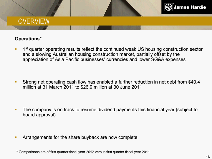 | Operations* 1st quarter operating results reflect the continued weak US housing construction sector and a slowing Australian housing construction market, partially offset by the appreciation of Asia Pacific businesses' currencies and lower SG&A expenses Strong net operating cash flow has enabled a further reduction in net debt from $40.4 million at 31 March 2011 to $26.9 million at 30 June 2011 The company is on track to resume dividend payments this financial year (subject to board approval) Arrangements for the share buyback are now complete 16 OVERVIEW * Comparisons are of first quarter fiscal year 2012 versus first quarter fiscal year 2011 |