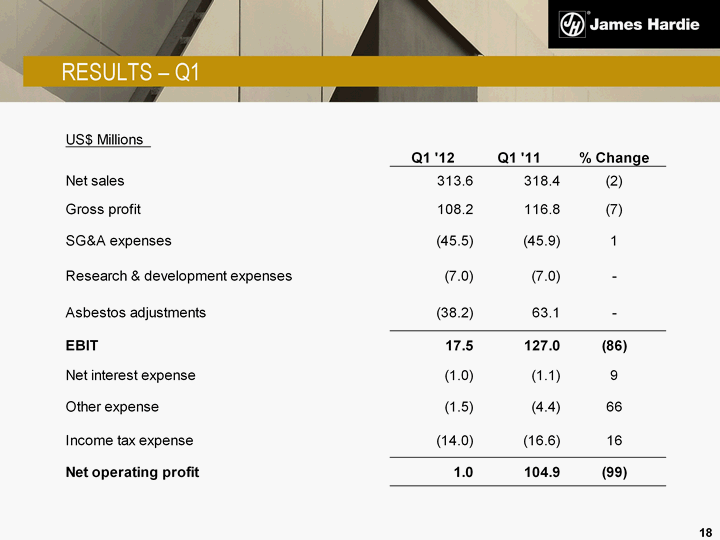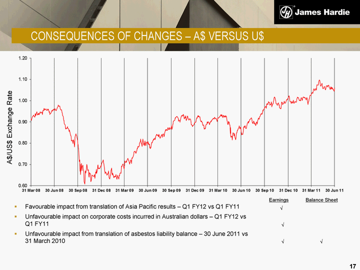 | A$/US$ Exchange Rate Favourable impact from translation of Asia Pacific results - Q1 FY12 vs Q1 FY11 Unfavourable impact on corporate costs incurred in Australian dollars - Q1 FY12 vs Q1 FY11 Unfavourable impact from translation of asbestos liability balance - 30 June 2011 vs 31 March 2010 17 Earnings Balance Sheet ^ ^ ^ ^ CONSEQUENCES OF CHANGES - A$ VERSUS U$ |