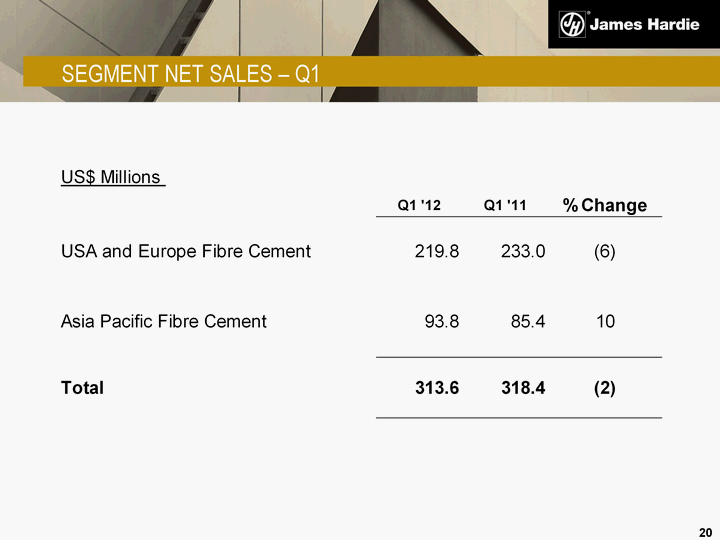 | 1st Quarter Result* Net Sales down 6% to US$219.8 million Sales Volume down 6% to 332.4 mmsf Average Price up 1% to US$661 per msf EBIT down 14% to US$48.0 million EBIT Margin down 2.3 pts to 21.8% 6 USA AND EUROPE FIBRE CEMENT * Comparisons are of first quarter fiscal year 2012 versus first quarter fiscal year 2011 |