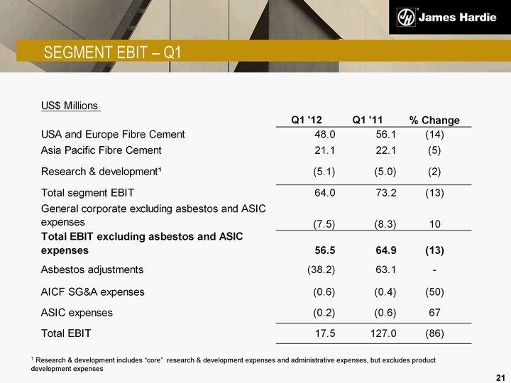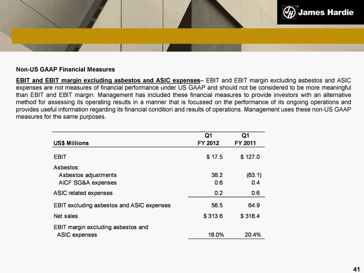 | Non-US GAAP Financial Measures EBIT and EBIT margin excluding asbestos and ASIC expenses- EBIT and EBIT margin excluding asbestos and ASIC expenses are not measures of financial performance under US GAAP and should not be considered to be more meaningful than EBIT and EBIT margin. Management has included these financial measures to provide investors with an alternative method for assessing its operating results in a manner that is focussed on the performance of its ongoing operations and provides useful information regarding its financial condition and results of operations. Management uses these non-US GAAP measures for the same purposes. 41 |