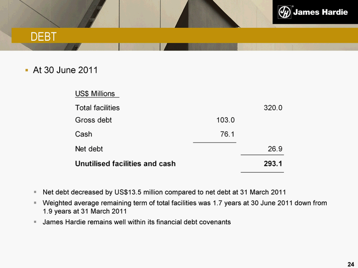 | Net debt decreased by US$13.5 million compared to net debt at 31 March 2011 Weighted average remaining term of total facilities was 1.7 years at 30 June 2011 down from 1.9 years at 31 March 2011 James Hardie remains well within its financial debt covenants 24 At 30 June 2011 DEBT |