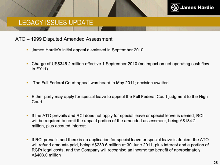 | 25 LEGACY ISSUES UPDATE ATO - 1999 Disputed Amended Assessment James Hardie's initial appeal dismissed in September 2010 Charge of US$345.2 million effective 1 September 2010 (no impact on net operating cash flow in FY11) The Full Federal Court appeal was heard in May 2011; decision awaited Either party may apply for special leave to appeal the Full Federal Court judgment to the High Court If the ATO prevails and RCI does not apply for special leave or special leave is denied, RCI will be required to remit the unpaid portion of the amended assessment, being A$184.2 million, plus accrued interest If RCI prevails and there is no application for special leave or special leave is denied, the ATO will refund amounts paid, being A$239.6 million at 30 June 2011, plus interest and a portion of RCI's legal costs, and the Company will recognise an income tax benefit of approximately A$403.0 million |