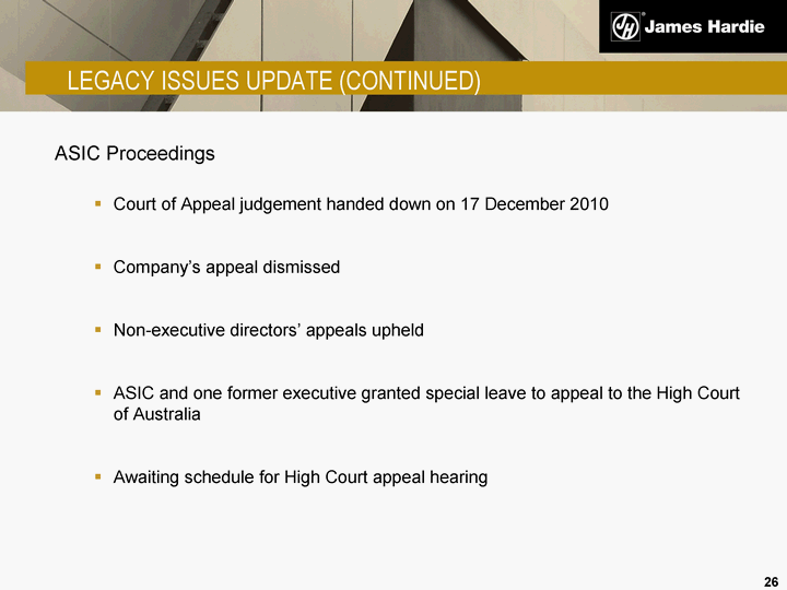 | 26 LEGACY ISSUES UPDATE (CONTINUED) ASIC Proceedings Court of Appeal judgement handed down on 17 December 2010 Company's appeal dismissed Non-executive directors' appeals upheld ASIC and one former executive granted special leave to appeal to the High Court of Australia Awaiting schedule for High Court appeal hearing |