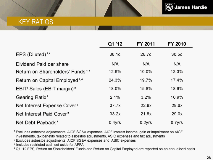 | 1 Excludes asbestos adjustments, AICF SG&A expenses, AICF interest income, gain or impairment on AICF investments, tax benefits related to asbestos adjustments, ASIC expenses and tax adjustments 2 Excludes asbestos adjustments, AICF SG&A expenses and ASIC expenses 3 Includes restricted cash set aside for AFFA 4 Q1 '12 EPS, Return on Shareholders' Funds and Return on Capital Employed are reported on an annualised basis 28 KEY RATIOS |