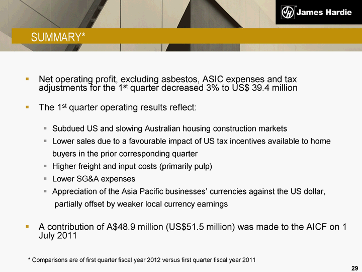 | 29 Net operating profit, excluding asbestos, ASIC expenses and tax adjustments for the 1st quarter decreased 3% to US$ 39.4 million The 1st quarter operating results reflect: Subdued US and slowing Australian housing construction markets Lower sales due to a favourable impact of US tax incentives available to home buyers in the prior corresponding quarter Higher freight and input costs (primarily pulp) Lower SG&A expenses Appreciation of the Asia Pacific businesses' currencies against the US dollar, partially offset by weaker local currency earnings A contribution of A$48.9 million (US$51.5 million) was made to the AICF on 1 July 2011 SUMMARY* * Comparisons are of first quarter fiscal year 2012 versus first quarter fiscal year 2011 |