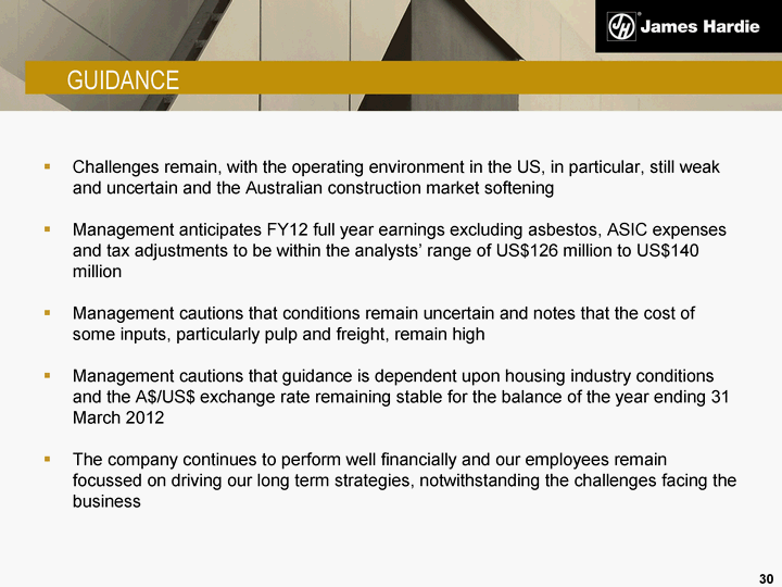 | 30 Challenges remain, with the operating environment in the US, in particular, still weak and uncertain and the Australian construction market softening Management anticipates FY12 full year earnings excluding asbestos, ASIC expenses and tax adjustments to be within the analysts' range of US$126 million to US$140 million Management cautions that conditions remain uncertain and notes that the cost of some inputs, particularly pulp and freight, remain high Management cautions that guidance is dependent upon housing industry conditions and the A$/US$ exchange rate remaining stable for the balance of the year ending 31 March 2012 The company continues to perform well financially and our employees remain focussed on driving our long term strategies, notwithstanding the challenges facing the business GUIDANCE |