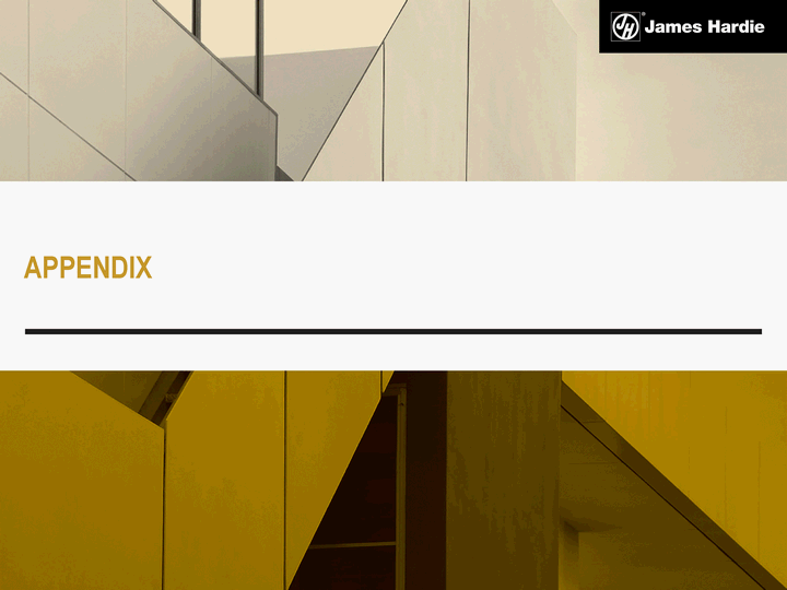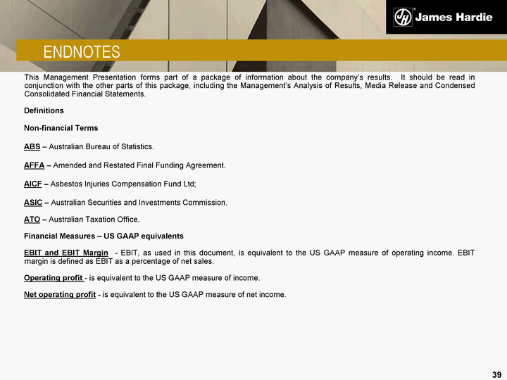 | 39 ENDNOTES This Management Presentation forms part of a package of information about the company's results. It should be read in conjunction with the other parts of this package, including the Management's Analysis of Results, Media Release and Condensed Consolidated Financial Statements. Definitions Non-financial Terms ABS - Australian Bureau of Statistics. AFFA - Amended and Restated Final Funding Agreement. AICF - Asbestos Injuries Compensation Fund Ltd; ASIC - Australian Securities and Investments Commission. ATO - Australian Taxation Office. Financial Measures - US GAAP equivalents EBIT and EBIT Margin - EBIT, as used in this document, is equivalent to the US GAAP measure of operating income. EBIT margin is defined as EBIT as a percentage of net sales. Operating profit - is equivalent to the US GAAP measure of income. Net operating profit - is equivalent to the US GAAP measure of net income. |