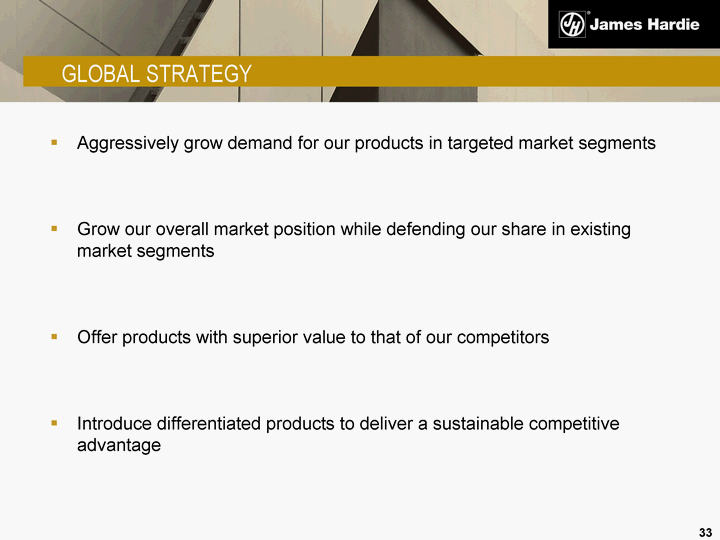 | Aggressively grow demand for our products in targeted market segments Grow our overall market position while defending our share in existing market segments Offer products with superior value to that of our competitors Introduce differentiated products to deliver a sustainable competitive advantage 33 GLOBAL STRATEGY |