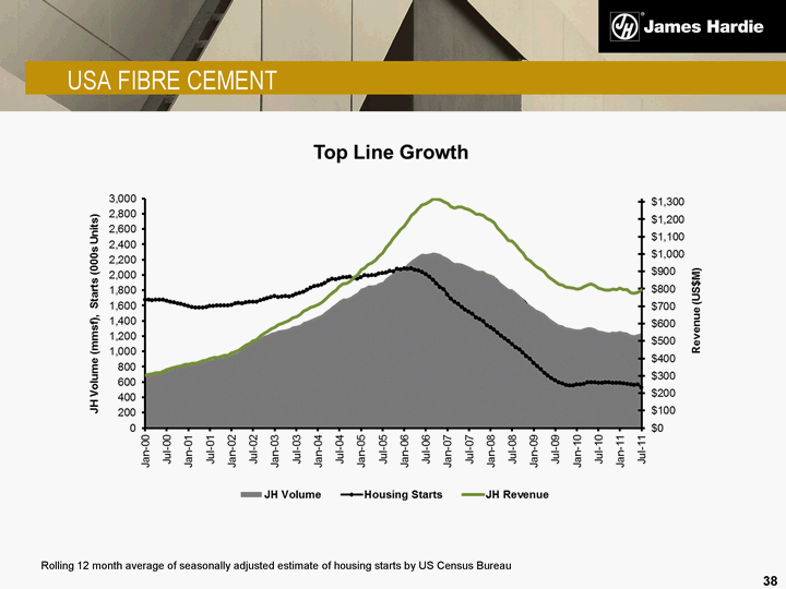 | Rolling 12 month average of seasonally adjusted estimate of housing starts by US Census Bureau 38 USA FIBRE CEMENT |