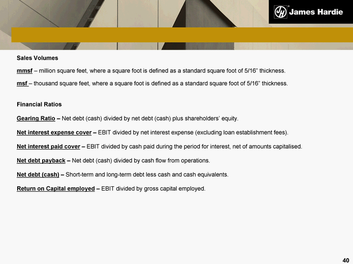 | Sales Volumes mmsf - million square feet, where a square foot is defined as a standard square foot of 5/16" thickness. msf - thousand square feet, where a square foot is defined as a standard square foot of 5/16" thickness. Financial Ratios Gearing Ratio - Net debt (cash) divided by net debt (cash) plus shareholders' equity. Net interest expense cover - EBIT divided by net interest expense (excluding loan establishment fees). Net interest paid cover - EBIT divided by cash paid during the period for interest, net of amounts capitalised. Net debt payback - Net debt (cash) divided by cash flow from operations. Net debt (cash) - Short-term and long-term debt less cash and cash equivalents. Return on Capital employed - EBIT divided by gross capital employed. 40 |