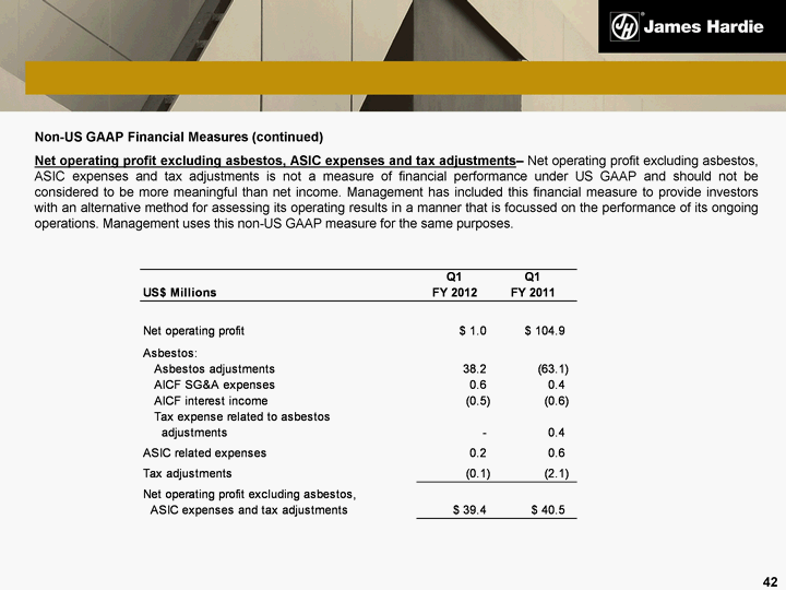 | Non-US GAAP Financial Measures (continued) Net operating profit excluding asbestos, ASIC expenses and tax adjustments- Net operating profit excluding asbestos, ASIC expenses and tax adjustments is not a measure of financial performance under US GAAP and should not be considered to be more meaningful than net income. Management has included this financial measure to provide investors with an alternative method for assessing its operating results in a manner that is focussed on the performance of its ongoing operations. Management uses this non-US GAAP measure for the same purposes. 42 |