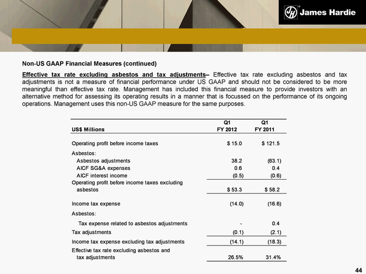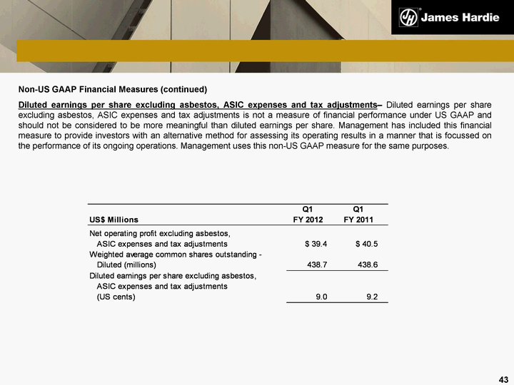 | Non-US GAAP Financial Measures (continued) Diluted earnings per share excluding asbestos, ASIC expenses and tax adjustments- Diluted earnings per share excluding asbestos, ASIC expenses and tax adjustments is not a measure of financial performance under US GAAP and should not be considered to be more meaningful than diluted earnings per share. Management has included this financial measure to provide investors with an alternative method for assessing its operating results in a manner that is focussed on the performance of its ongoing operations. Management uses this non-US GAAP measure for the same purposes. 43 |