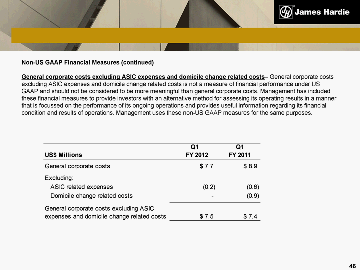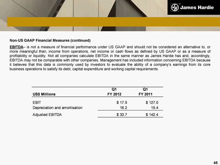| Non-US GAAP Financial Measures (continued) EBITDA- is not a measure of financial performance under US GAAP and should not be considered an alternative to, or more meaningful than, income from operations, net income or cash flows as defined by US GAAP or as a measure of profitability or liquidity. Not all companies calculate EBITDA in the same manner as James Hardie has and, accordingly, EBITDA may not be comparable with other companies. Management has included information concerning EBITDA because it believes that this data is commonly used by investors to evaluate the ability of a company's earnings from its core business operations to satisfy its debt, capital expenditure and working capital requirements. 45 |