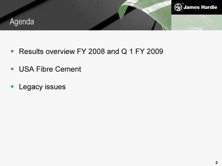 | Results overview FY 2008 and Q 1 FY 2009 USA Fibre Cement Legacy issues Agenda |