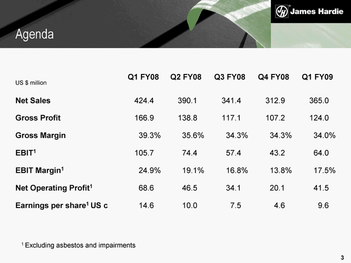 | US $ million Q1 FY08 Q2 FY08 Q3 FY08 Q4 FY08 Q1 FY09 Net Sales 424.4 390.1 341.4 312.9 365.0 Gross Profit 166.9 138.8 117.1 107.2 124.0 Gross Margin 39.3% 35.6% 34.3% 34.3% 34.0% EBIT1 105.7 74.4 57.4 43.2 64.0 EBIT Margin1 24.9% 19.1% 16.8% 13.8% 17.5% Net Operating Profit1 68.6 46.5 34.1 20.1 41.5 Earnings per share1 US c 14.6 10.0 7.5 4.6 9.6 1 Excluding asbestos and impairments Agenda |