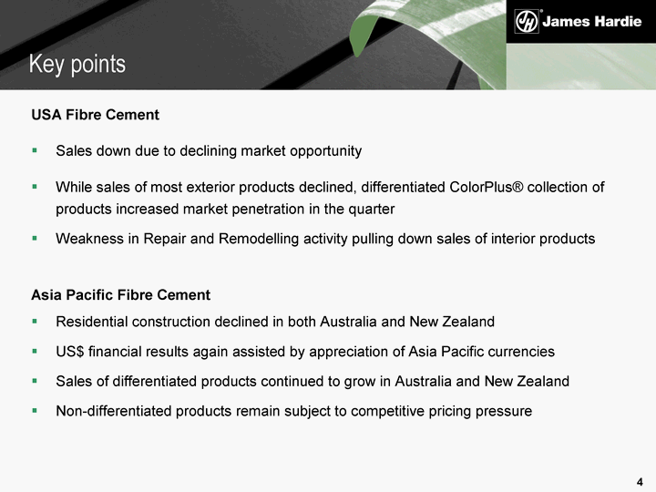 | USA Fibre Cement Sales down due to declining market opportunity While sales of most exterior products declined, differentiated ColorPlus(r) collection of products increased market penetration in the quarter Weakness in Repair and Remodelling activity pulling down sales of interior products Asia Pacific Fibre Cement Residential construction declined in both Australia and New Zealand US$ financial results again assisted by appreciation of Asia Pacific currencies Sales of differentiated products continued to grow in Australia and New Zealand Non-differentiated products remain subject to competitive pricing pressure Key points |