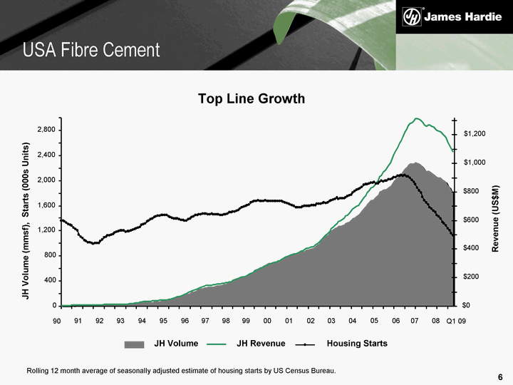 | Top Line Growth 0 400 800 1,200 1,600 2,000 2,400 2,800 90 91 92 93 94 95 96 97 98 99 00 01 02 03 04 05 06 07 08 $0 $200 $400 $600 $800 $1,000 $1,200 Revenue (US$M) JH Volume JH Revenue Housing Starts Q1 09 JH Volume (mmsf), Starts (000s Units) Rolling 12 month average of seasonally adjusted estimate of housing starts by US Census Bureau. USA Fibre Cement |
