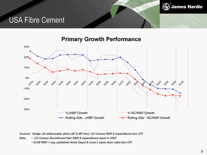 | Primary Growth Performance USA Fibre Cement Sources: Dodge US addressable starts (SF & MF-low); US Census R&R $ expenditures less CPI Note: US Census discontinued their R&R $ expenditures report in 2007 Q108 R&R = avg. published Home Depot & Lowe's same store sales less CPI - -30% - -20% - -10% 0% 10% 20% 30% Q104 Q204 Q304 Q404 Q105 Q205 Q305 Q405 Q106 Q206 Q306 Q406 Q107 Q207 Q307 Q407 Q108 Q208 Q308 Q408 Q109 %JHBP Growth % NC/R&R Growth Rolling 4Qtr - JHBP Growth Rolling 4Qtr - NC/R&R Growth |